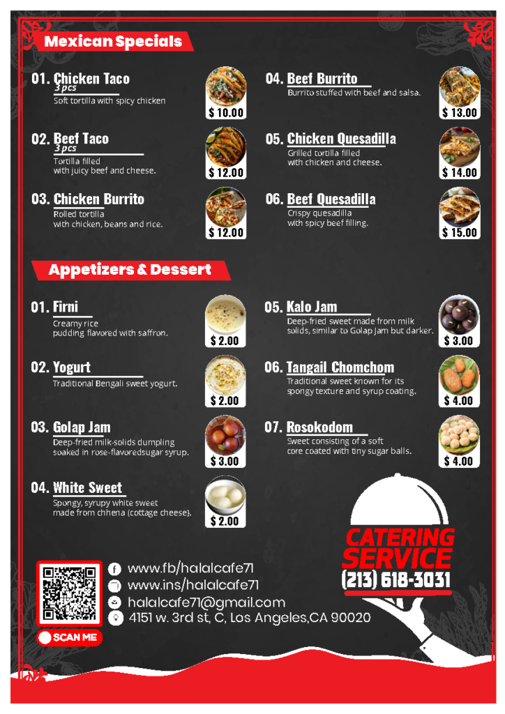 Make your event unforgettable with our authentic halal catering, featuring Bangladeshi, Indian, Pakistani, Mexican, and Mediterranean cuisine. Contact us today to customize your menu and serve your guests with confidence.